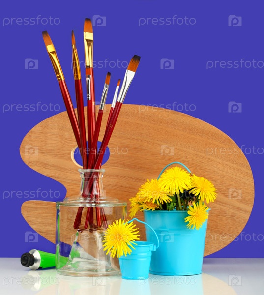 Одуванчики, стоящие рядом с кисточками для рисования