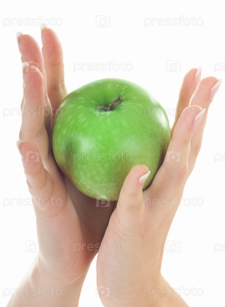 Зеленое яблоко в женских руках на белом фоне