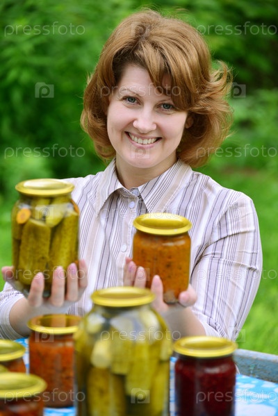 Домохозяйка и домашние соленья и варенье в саду