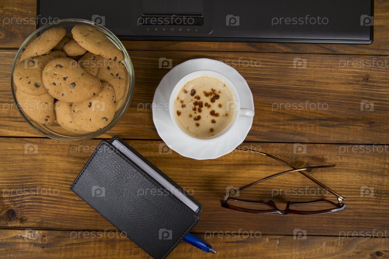 Компьютер, чашка кофе и печенье