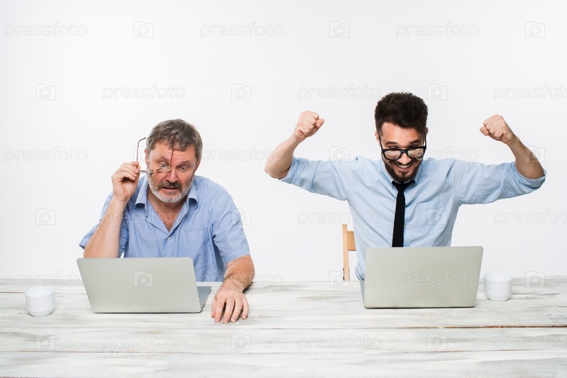 Двое коллег, работающих вместе в офисе на белом фоне