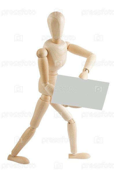 Деревянный человечек с листком бумаги на белом фоне