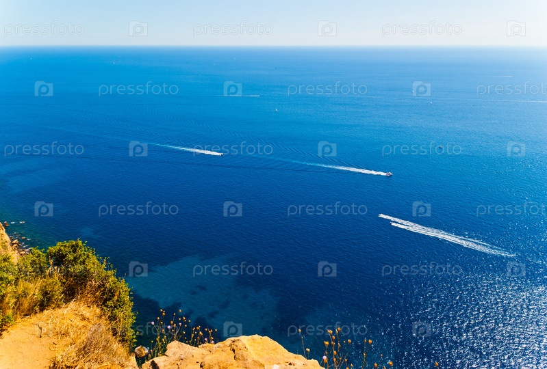 Лодки в Средиземном море. Вид на море с высокой скалы