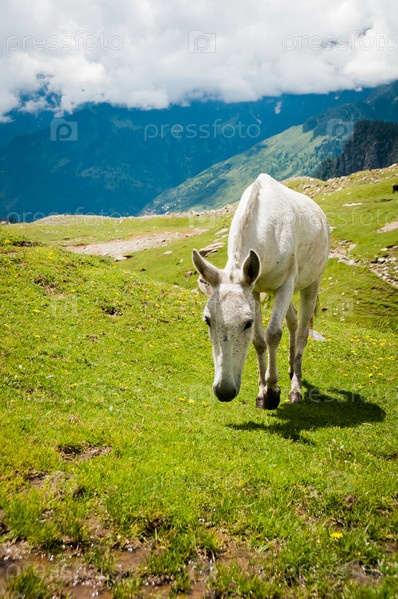 Белая лошадь на горных пастбищах в Гималаях, Северная Индия