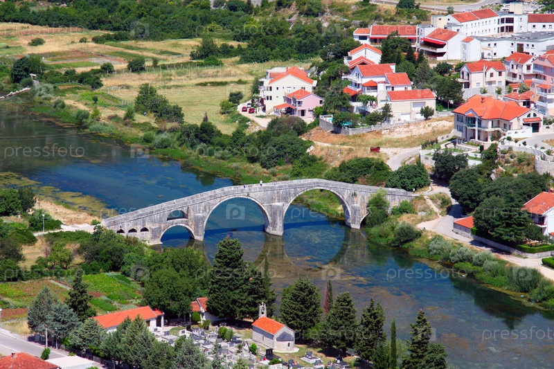 Древний арочный мост в старинном европейском городе с высоты птичьего полета