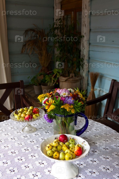 Букет цветов и вазы с яблоками на столе в деревенском доме