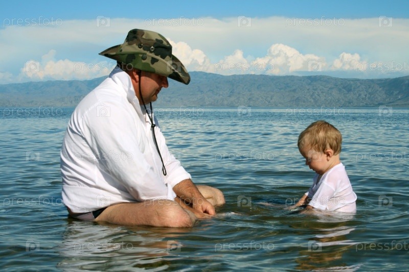 Отец с маленьким ребенком купаются в море