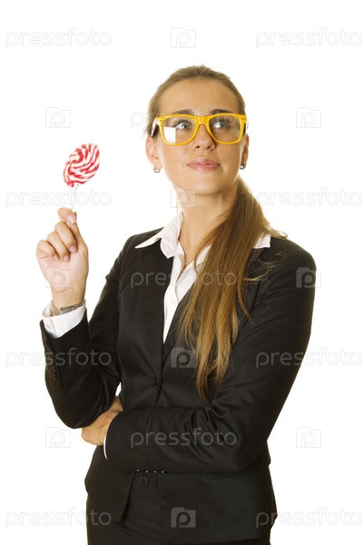 Девушка с леденцом на белом фоне