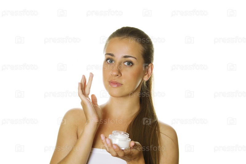 Девушка намазывает лицо кремом на белом фоне