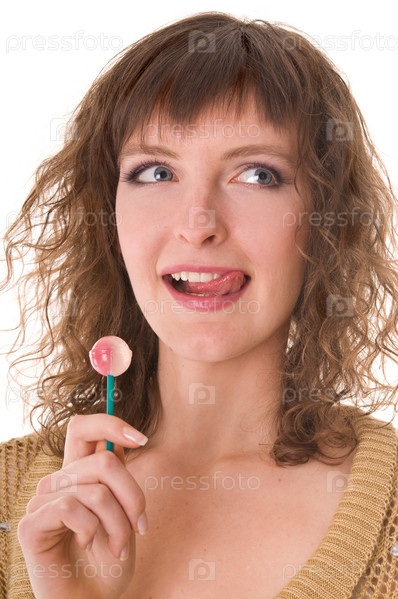 Женщина с леденцом в руке на белом фоне