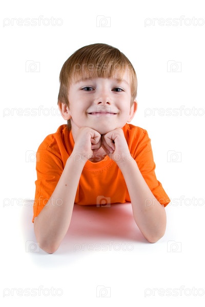 Веселый задумчивый мальчик на белом фоне