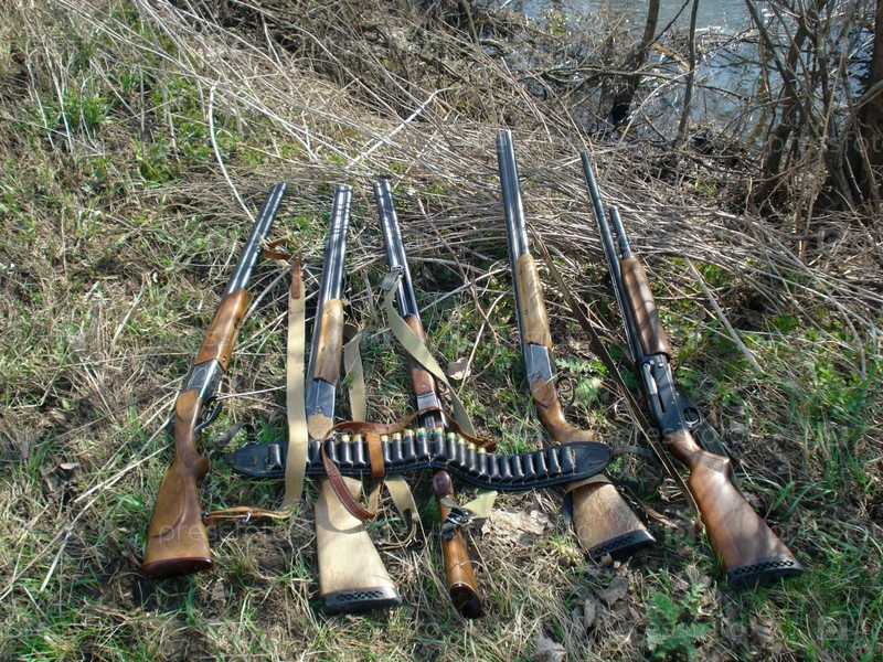 Охотничьи ружья и патронташ лежат на траве