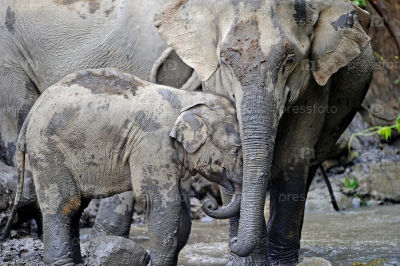 Нежная любящая мать и детеныш азиатских слонов