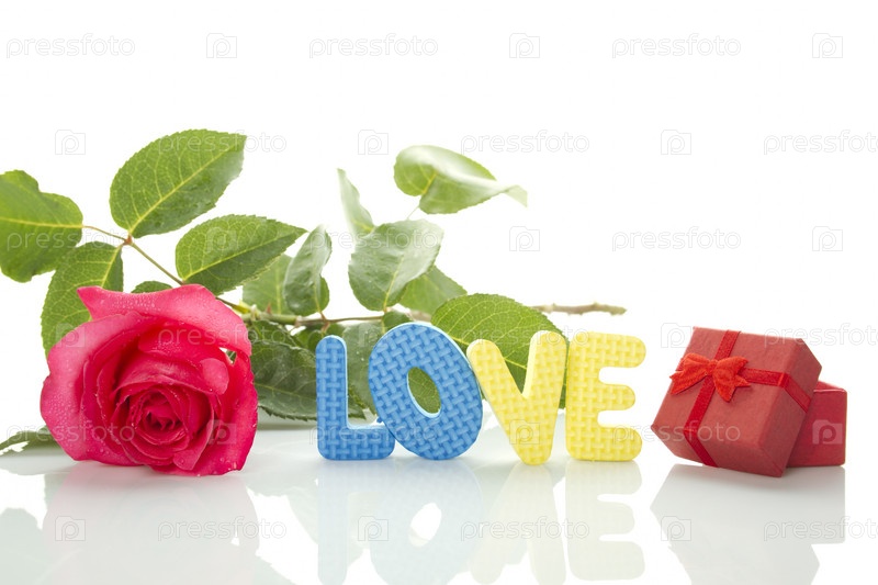 Красивая красная роза, подарок и надпись "Любовь"