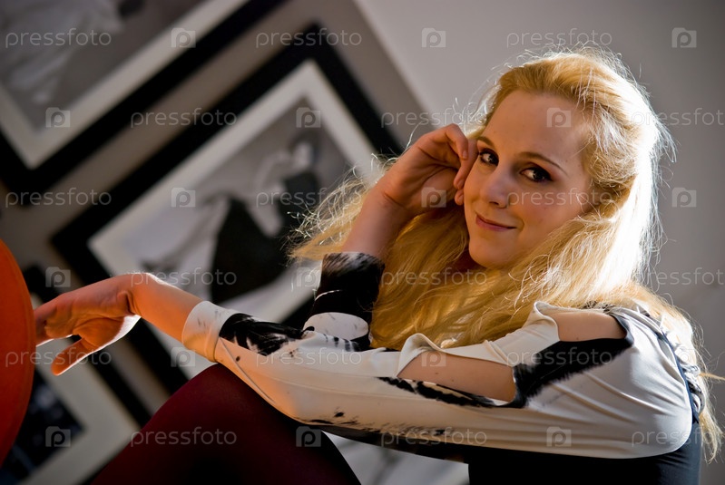 Блондинка на фоне портретов