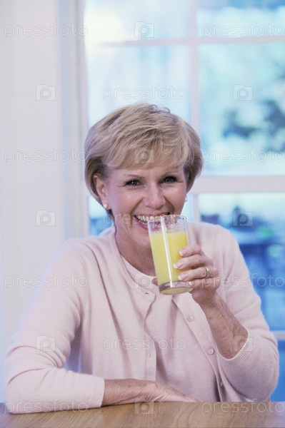 Портрет пожилой женщины, выпить стакан апельсинового сока