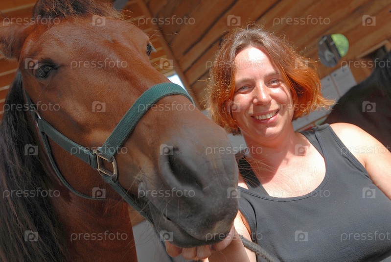 Женщина и лошади в конюшне