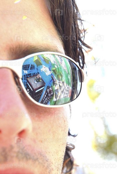 Отражение граффити в солнцезащитные очки молодого человека