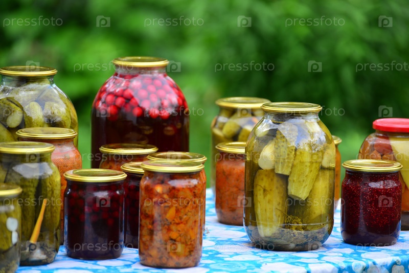 Домашние консервированные овощи в саду в летнее время