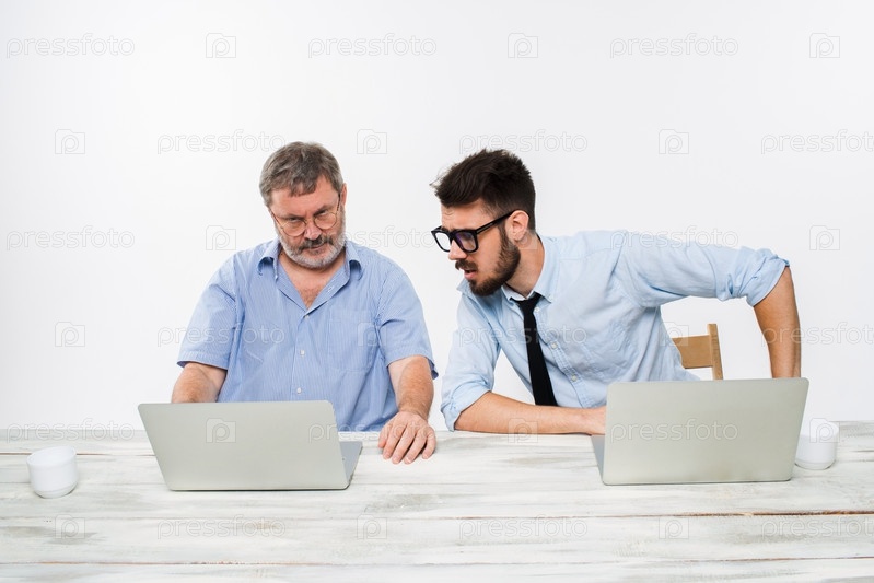 Двух коллег, работающих вместе в офисе на белом фоне