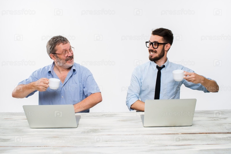 Двух коллег, работающих вместе в офисе на белом фоне