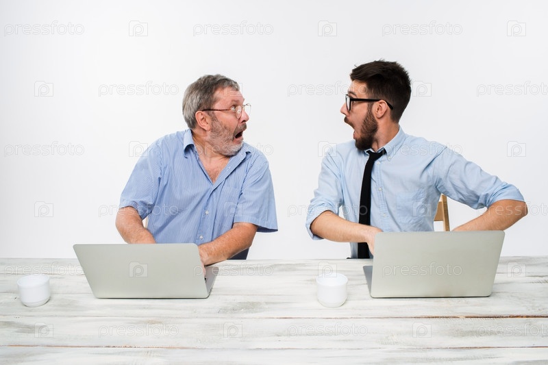Двух коллег, работающих вместе в офисе на белом фоне