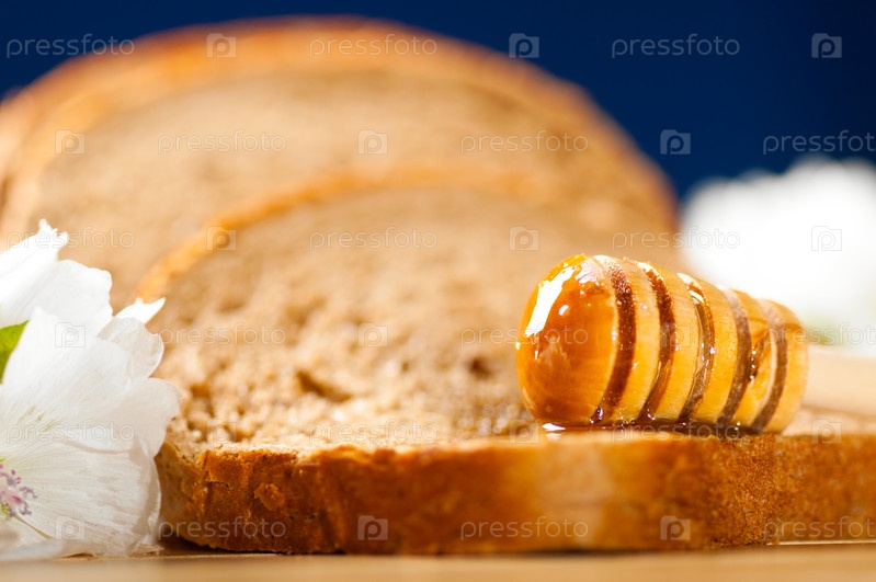 Палочка с медом и куски хлеба, голубой фон