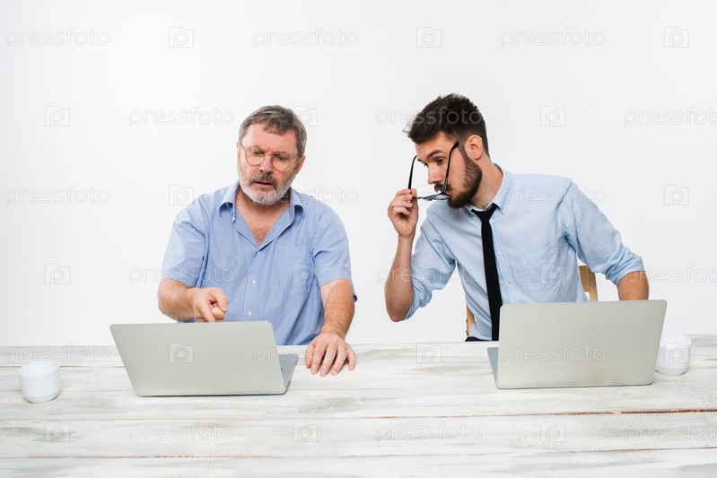 Двух коллег, работающих вместе в офисе на белом фоне