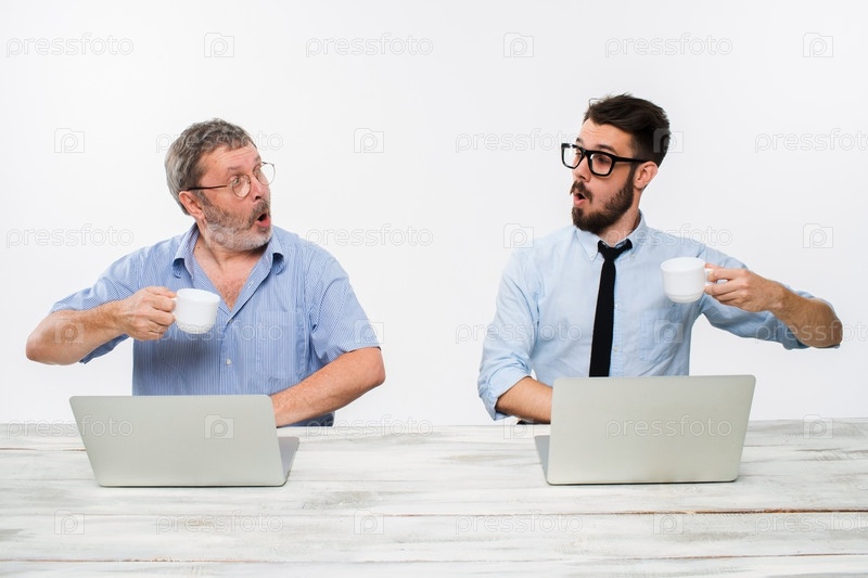 Двух коллег, работающих вместе в офисе на белом фоне