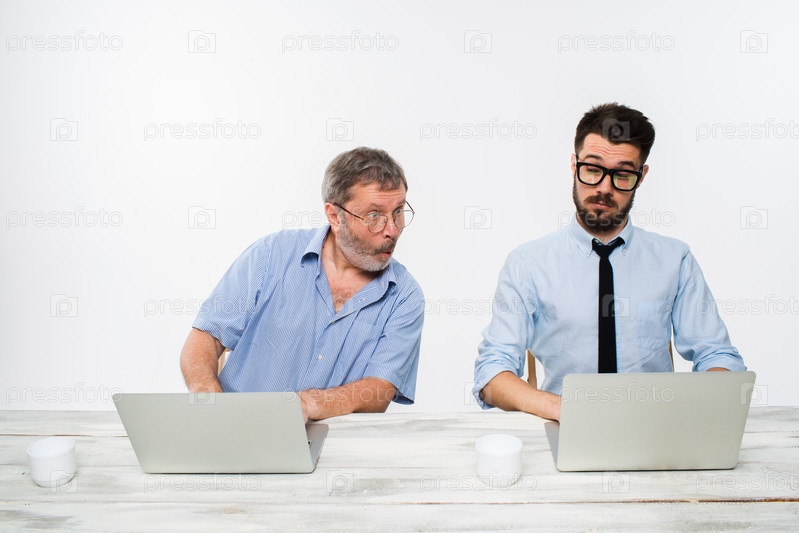 Двух коллег, работающих вместе в офисе на белом фоне