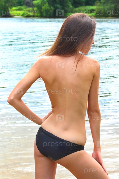 Полуобнаженная девушка стоит спиной к камере на берегу озера