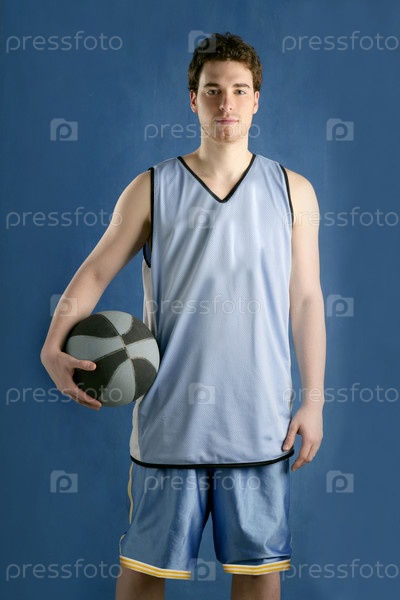 Молодой человек корзина игрока над синий гранж-фон