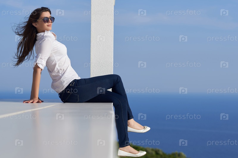 Расслабленной женщина перед современного дома