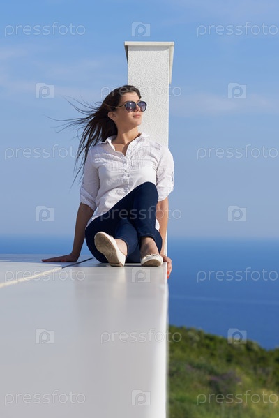 Расслабленной женщина перед современного дома