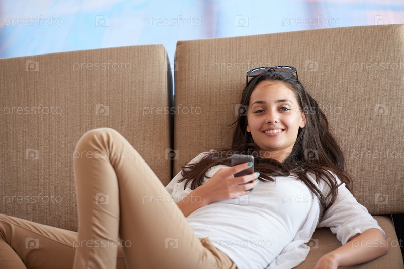 Молодая женщина, используя сотовый телефон дома