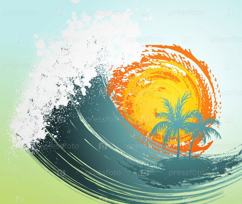 Тропический фон с пальмами, волн и солнца