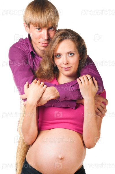 Муж и беременная жена на белом фоне