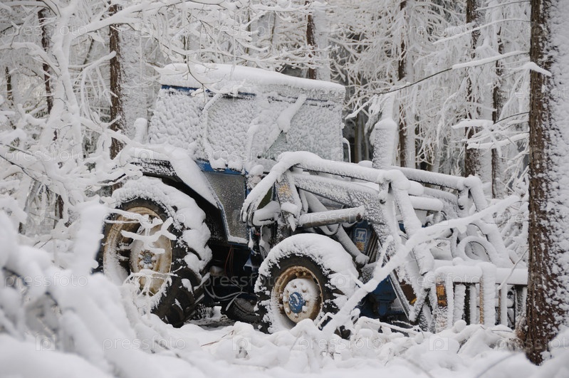 Заснеженный трактор в лесу