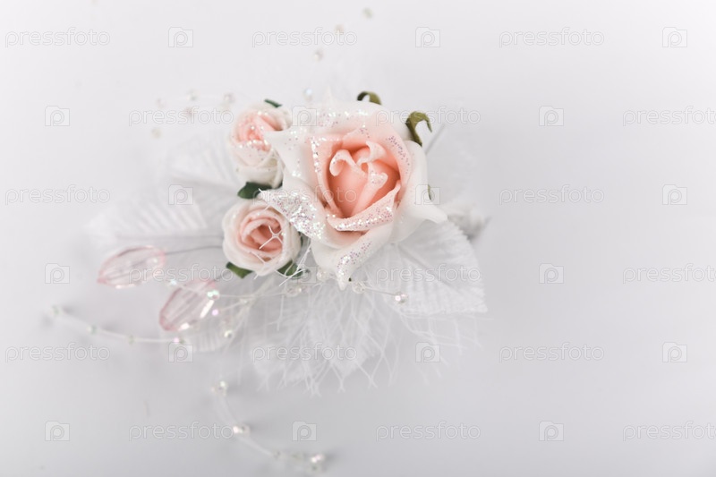 Свадебная бутоньерка из розовых роз на белом фоне