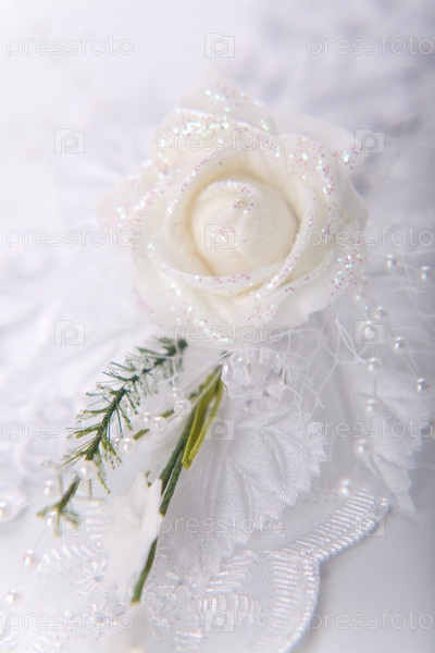 Свадебная бутоньерка из белой розы на белом фоне