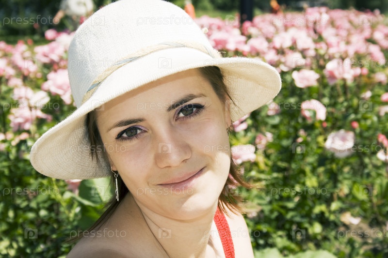 Молодая женщина в шляпе у цветочной клумбы