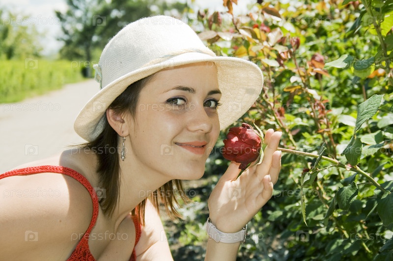 Молодая женщина в шляпе у цветочной клумбы