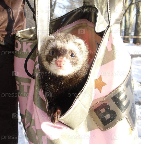 Хорек выглядывает из женской сумки