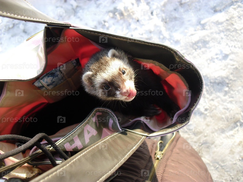 Хорек выглядывает из женской сумки