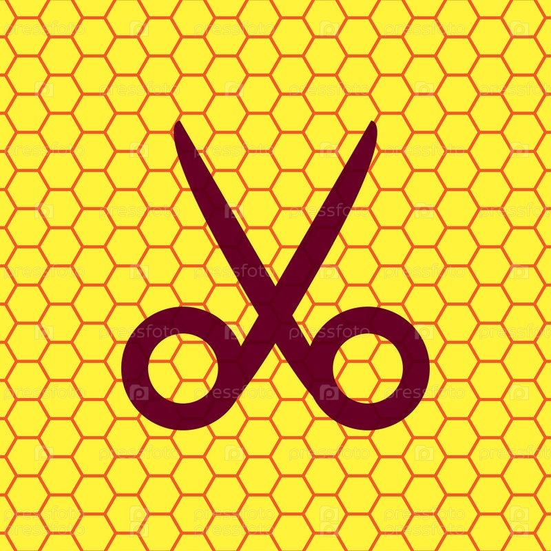 Ножницы парикмахерские значок символ на желтом фоне Аннотация похож на пчелиные соты. Вектор