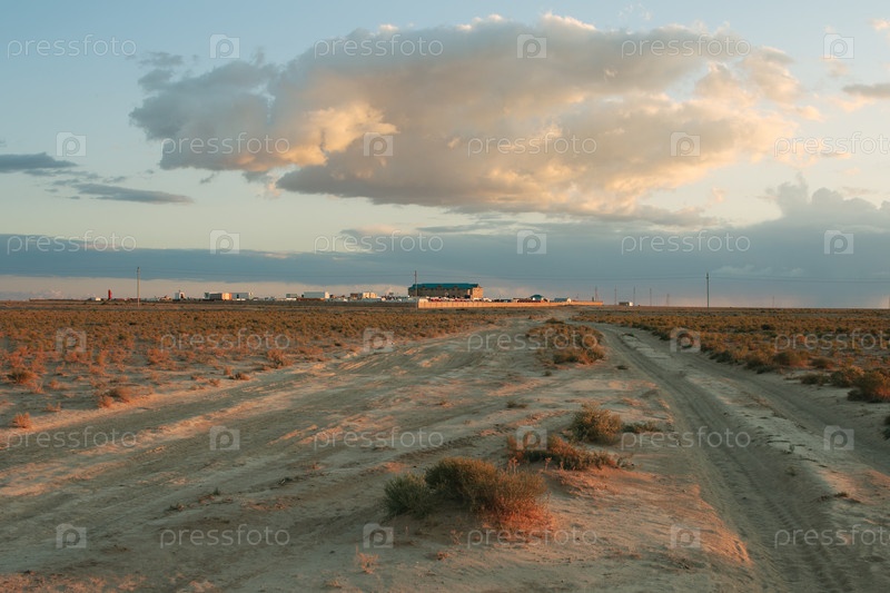 Закат. Дорога и большое облако над придорожной гостиницей вдали