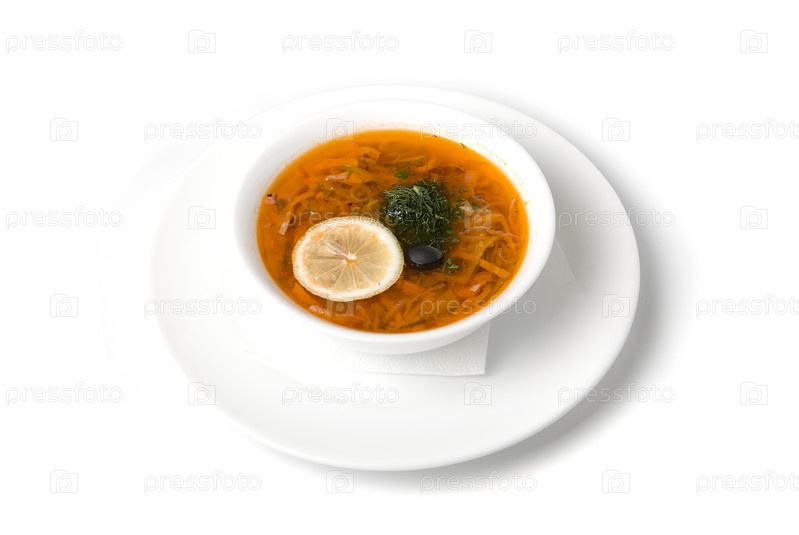 Борщ с лимоном и зеленью в белой тарелке. Изолированный на белом фоне