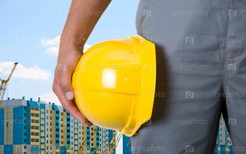 Крупным планом желтый шлем в руках у строителя на фоне строящихся домов