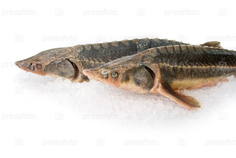 Две стерляди на кусочках льда. Изолированные на белом фоне
