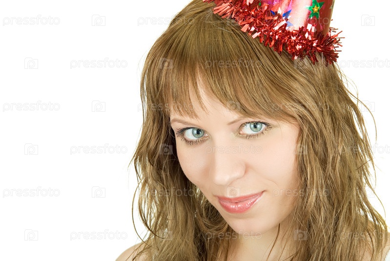 Красивая девушка в праздничном колпаке на белом фоне